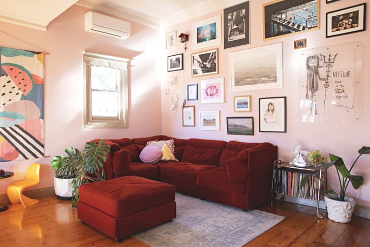 Often, pink and red rooms can feel like you're living inside a Valentine's Day card. If you want to give this color combination a cool, modern edge, trade in the bubblegum pink for a subtle blush or millennial pink. In this eclectic Australian abode, the blush acts as a neutral ground, so the red sectional can be the center of attention.